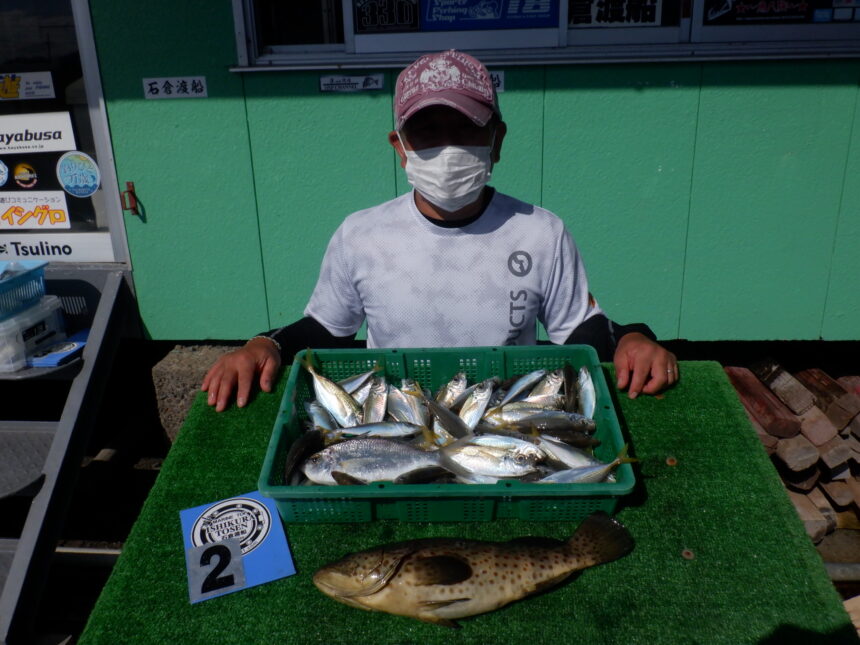 船外機ボートで新本さんがツバス、マダイ、アジ、カワハギをゲット。