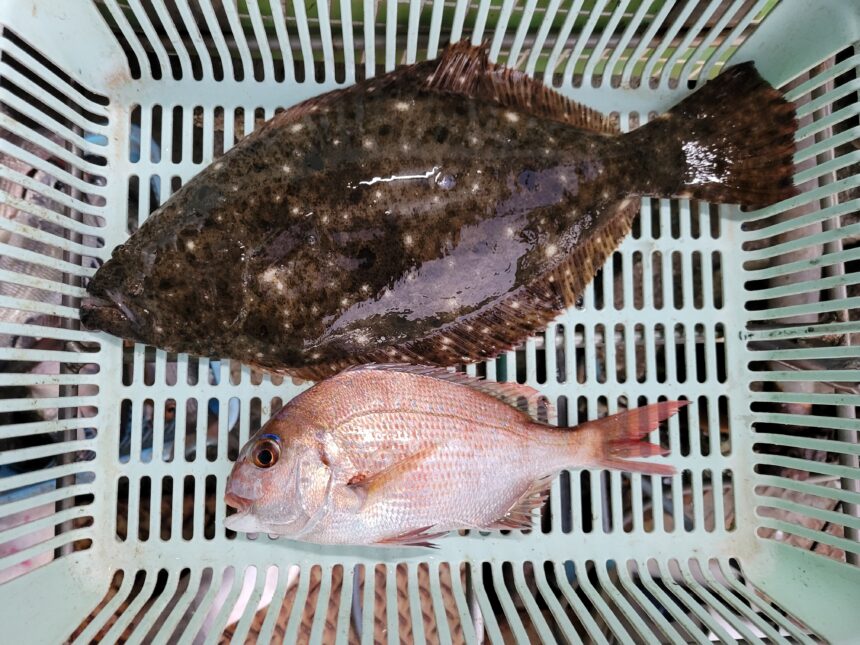 カセ釣りで廣橋さんがヒラメ、マダイをゲット。