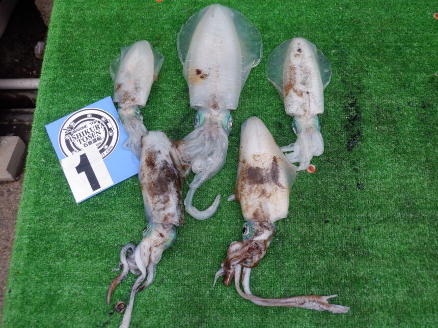 手漕ぎボートで吉岡さんがアオリイカをゲット。