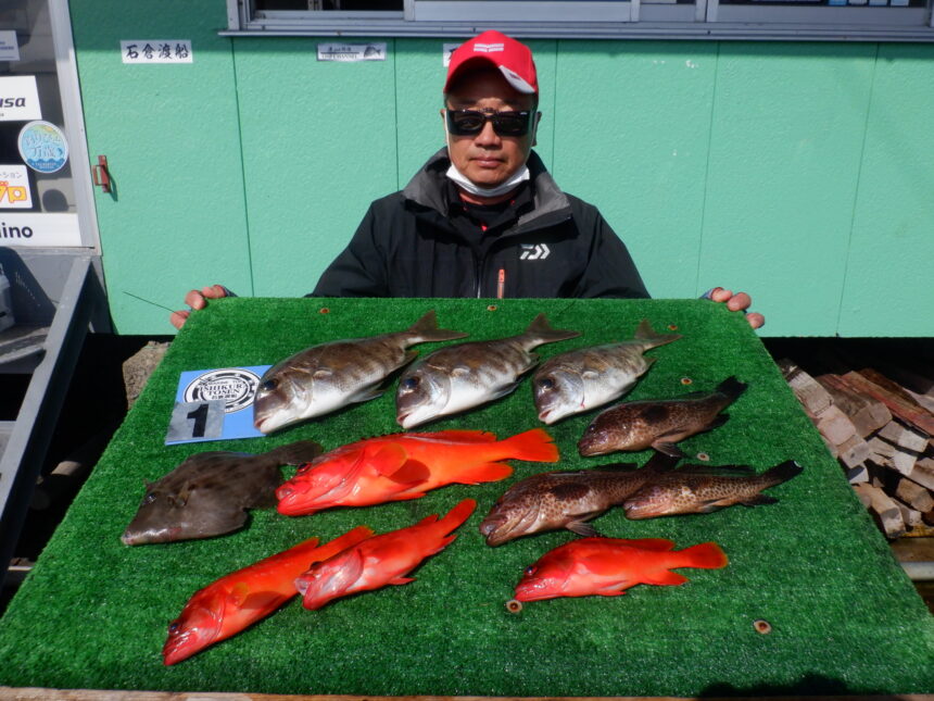 船外機ボートで松原さんがメイチ、アカハタ、オオモンハタ、カワハギをゲット。
