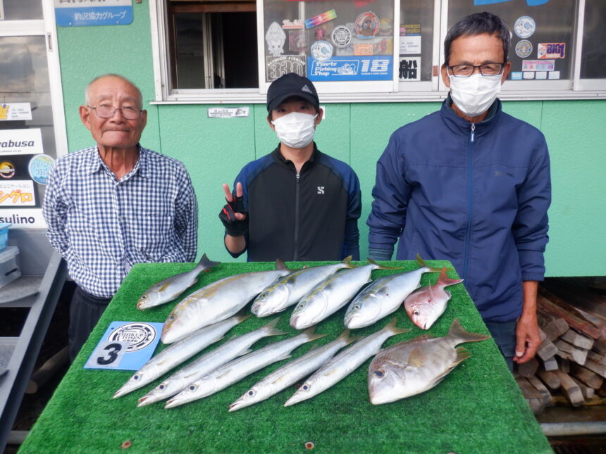 船外機ボートで岡崎さんがシオ、ツバス、メイチ、カマスをゲット。