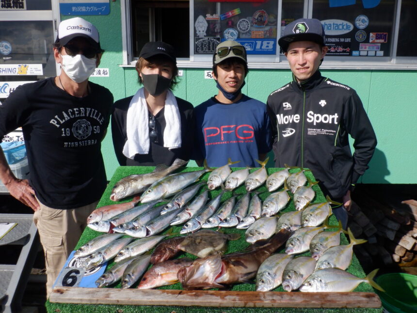 船外機ボートで石丸さんがシマアジ、コロダイ、クエ、サバをゲット。