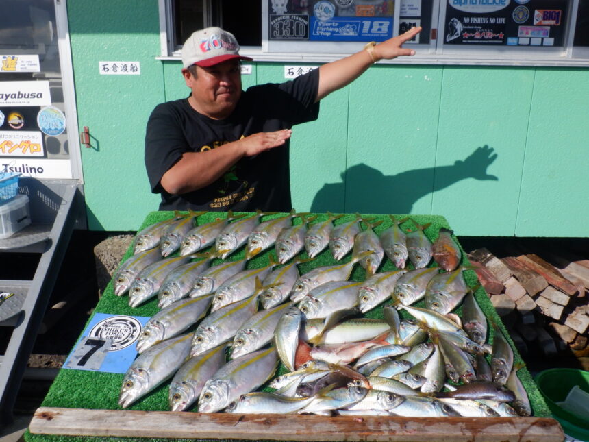 船外機ボートで岩本さんがシマアジ、アジをゲット。