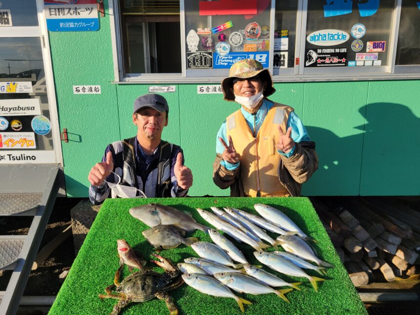 カセ釣りで石原さん&千田さんがアジ、カマス、カワハギ、ウマヅラハギをゲット。