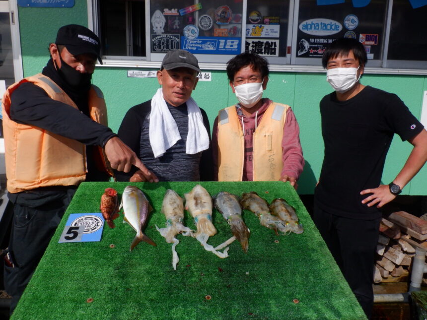 船外機ボートで佐藤さんがアオリイカ、シオ、カサゴをゲット。