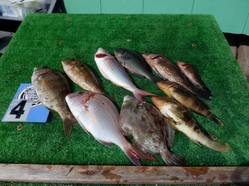 船外機ボートで三谷さんがメイチ、マダイ、カワハギ、アオハタをゲット。