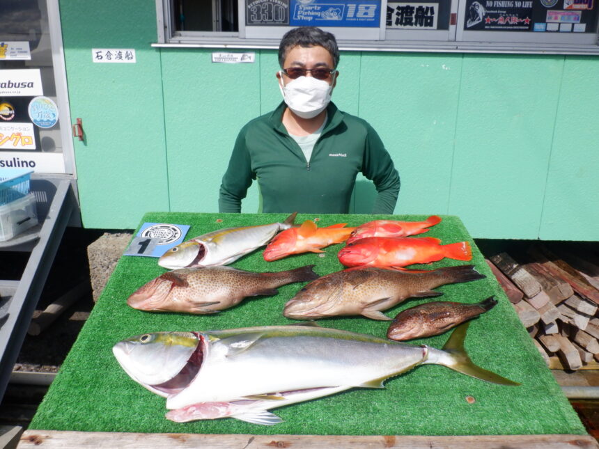 2022.10.21 UP ボート釣り釣果 船外機ボートで杉浦さんがワラサ70cm、オオモンハタ47cmまで、アカハタ、シオをゲット。 釣行日 2022年10月21日 釣り人 杉浦さん コメント ノマセ