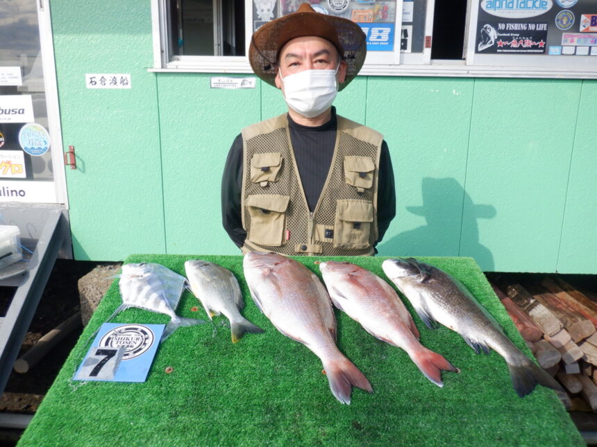 船外機ボートで鵜瀬さんがマダイ、チヌ、キビレをゲット。