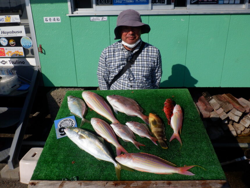 船外機ボートで黒瀬さんがマダイ、イトヨリ、カイワリ、ツバスをゲット。