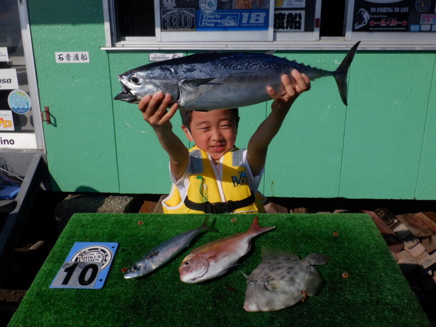 船外機ボートでそうま君、ゆうと君、さくと君がソウダカツオ、カマス、オオモンハタをゲット。