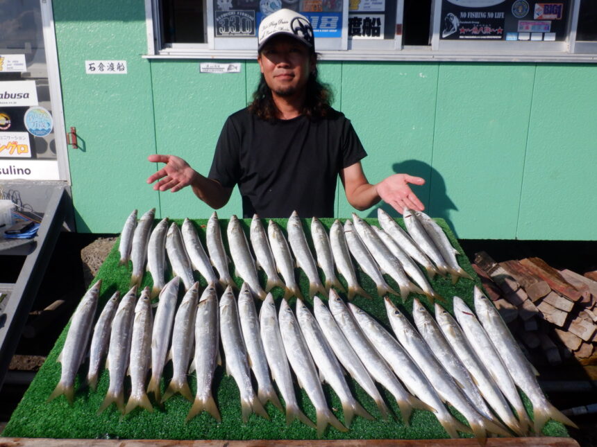 船外機ボートでそうま君、ゆうと君、さくと君がソウダカツオ、カマス、オオモンハタをゲット。