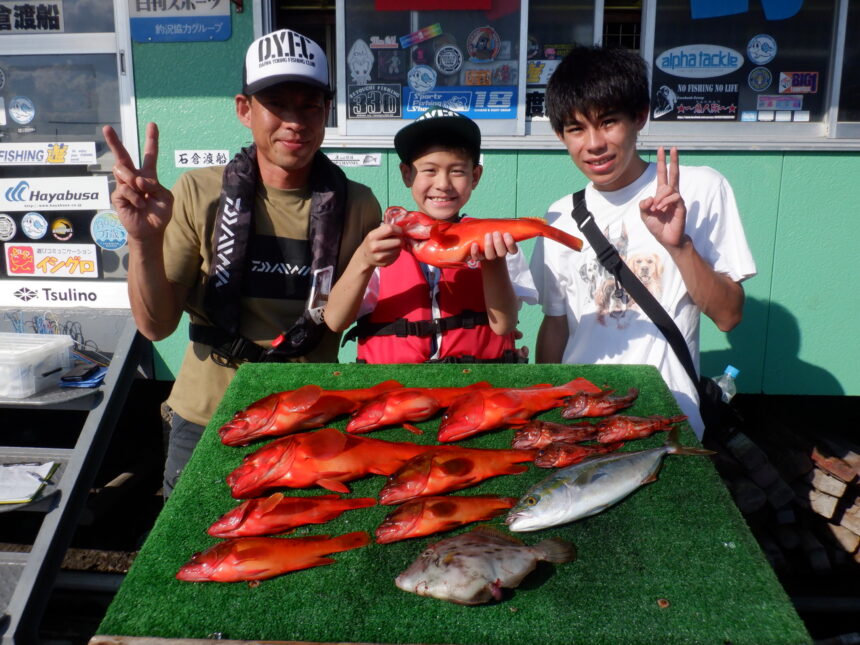 船外機ボートで田畑さんがアカハタ、カサゴ、ツバス、カワハギをゲット。