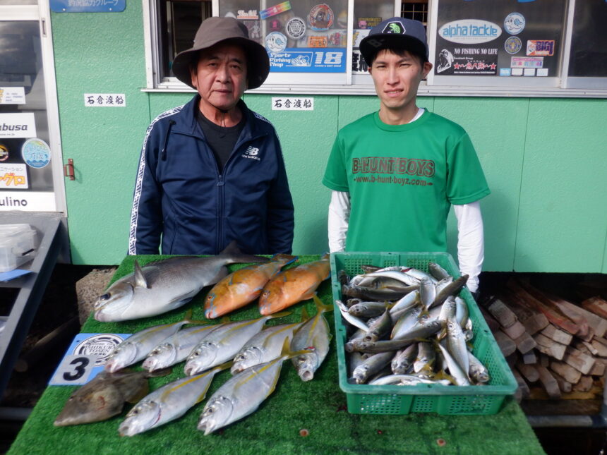 船外機ボートで石丸さんがシマアジ、アジ、カワハギ、ヒブダイ、イスズミをゲット。