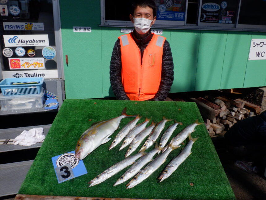 船外機ボートで藤巻さんがシマアジ、メイチ、ツバス、イサキをゲット。