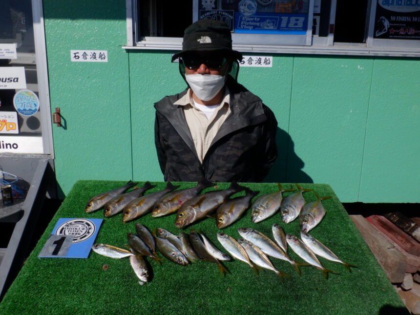 船外機ボートで尾垣さんがイサキ、アジ、シマアジをゲット。