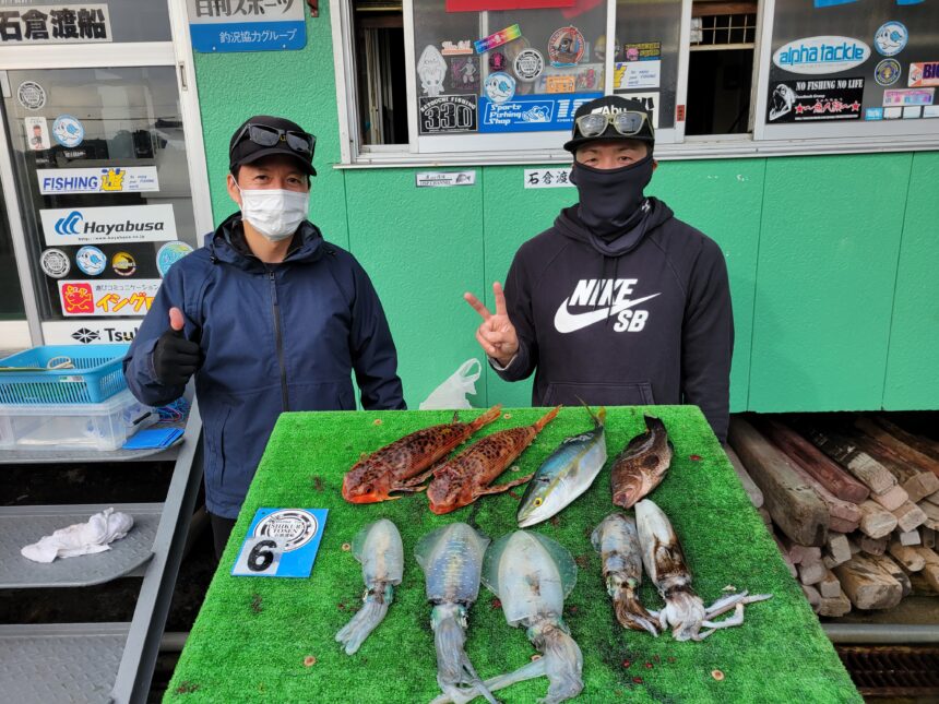 船外機ボートで浜田さんがアオリイカ、ツバス、セミホウボウをゲット。