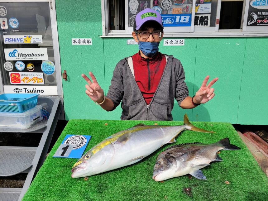 船外機ボートで中村さんがワラサ、チヌをゲット。