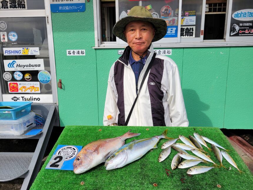船外機ボートで伊藤さんがツバス、マダイ、アジをゲット。