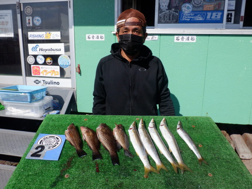 船外機ボートで堤さんがイサキ、シマアジ、グレをゲット。
