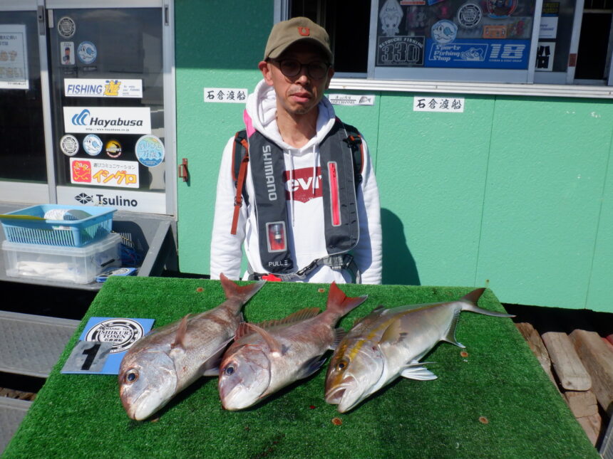 船外機ボートで堤さんがイサキ、シマアジ、グレをゲット。