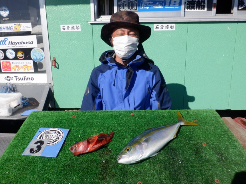 船外機ボートで三崎さんがツバス、カサゴをゲット。