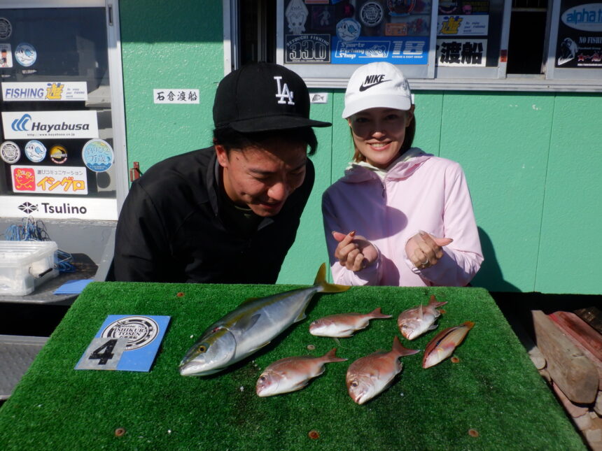 船外機ボートで佐藤さんがツバス、マダイをゲット。
