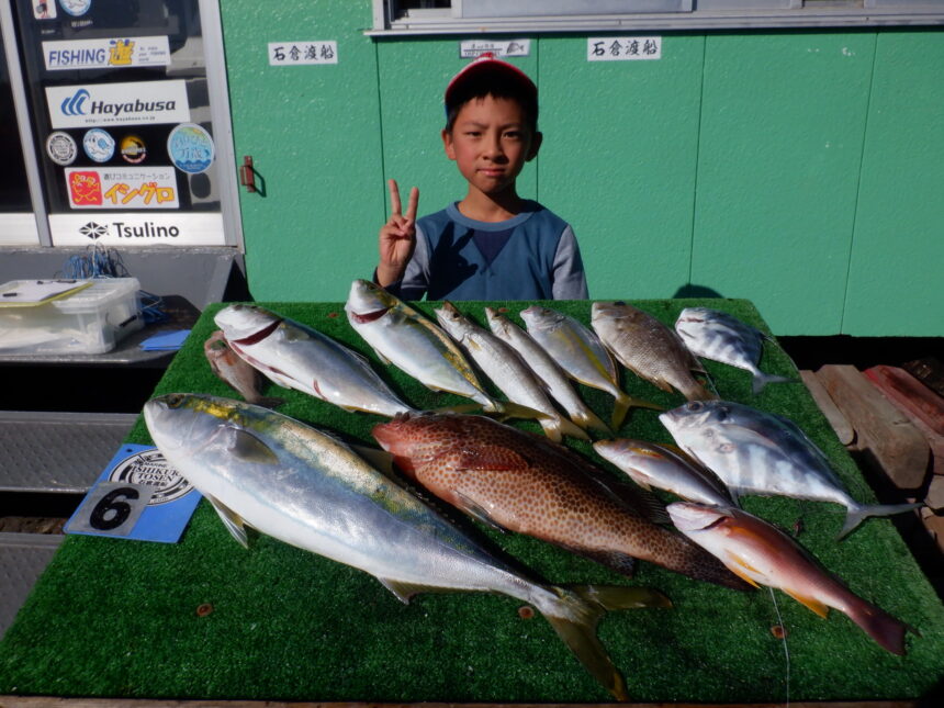 船外機ボートでたいせい君がワラサ、ツバス、オオモンハタ、カマス、メイチをゲット。