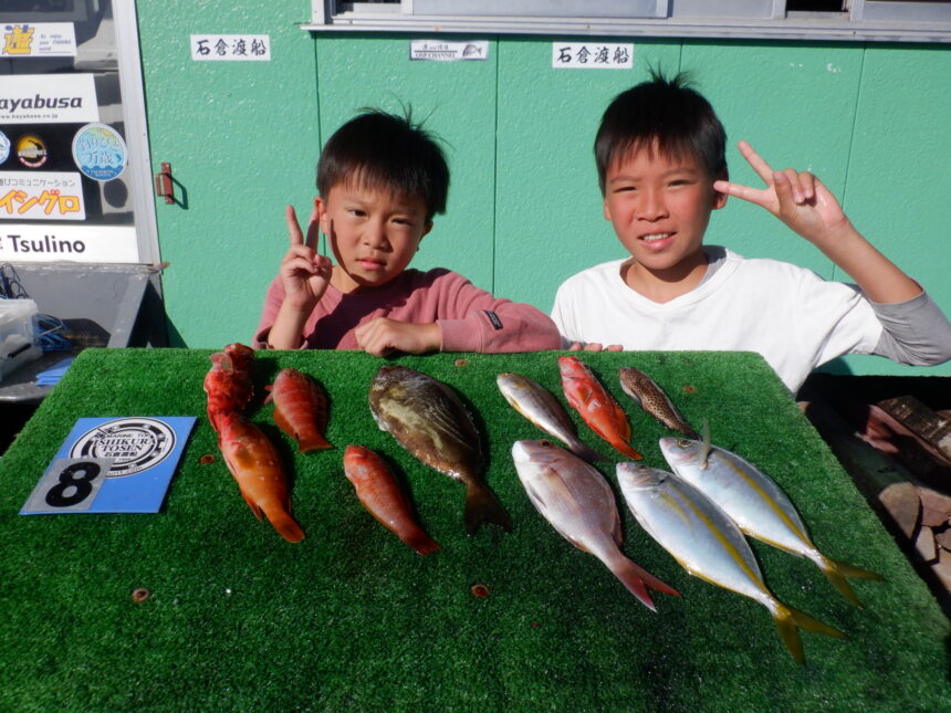 船外機ボートでけいた君&ゆうし君がシマアジ、アカハタ、アイゴ、カサゴをゲット。