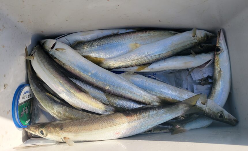 船外機ボートで竹田さんがシマアジ、シイラ、イサキ、ツバスをゲット。