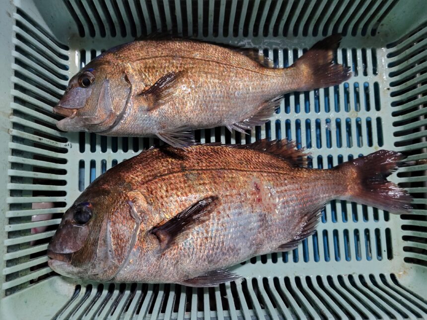 カセ釣りで岡本さんがマダイをゲット。