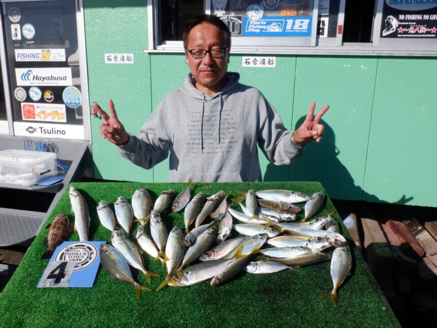 船外機ボートで竹田さんがシマアジ、シイラ、イサキ、ツバスをゲット。