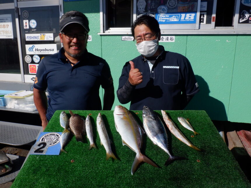 船外機ボートで水野さんがツバス、オオモンハタ、シマアジをゲット。