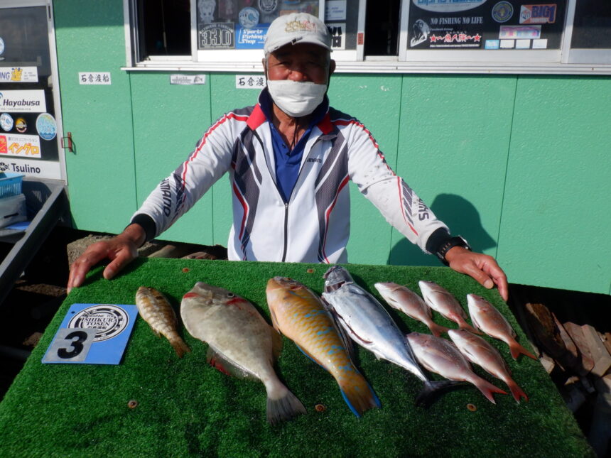 船外機ボートで松本さんがカワハギ、メイチ、マダイをゲット。