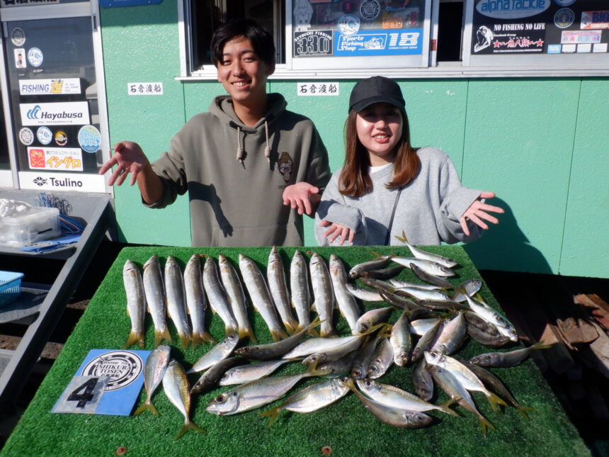 手漕ぎボートで岡本さんがカマス、アジをゲット。