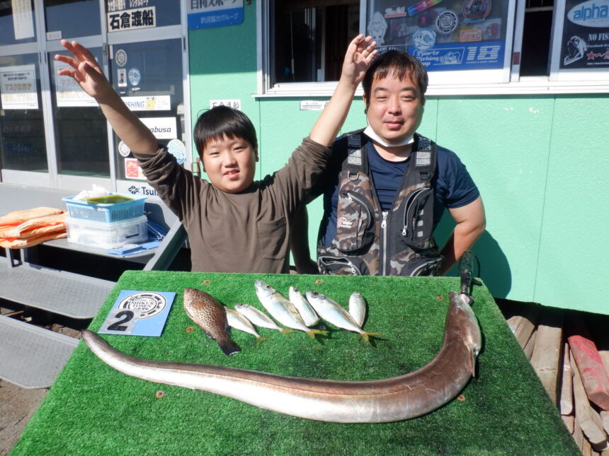 手漕ぎボートで安立さんがハモ、アジ、オオモンハタをゲット。