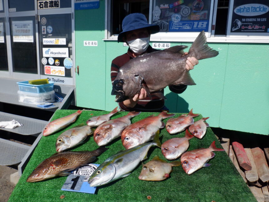 船外機ボートでイシダイ66cm、マダイ、メイチ、オオモンハタ、イトヨリ、カワハギをゲット。
