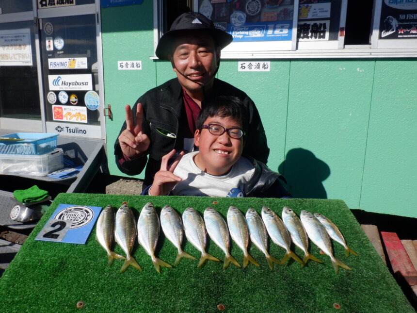 船外機ボートでそうま君、ゆうと君、さくと君がソウダカツオ、カマス、オオモンハタをゲット。