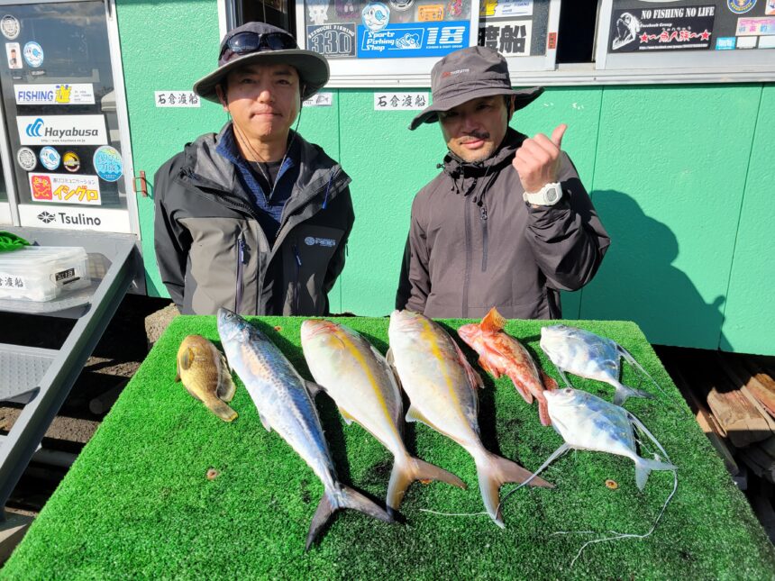 船外機ボートで水越さんがシオ、サゴシ、カサゴ、イトヒキアジ、アオハタをゲット。