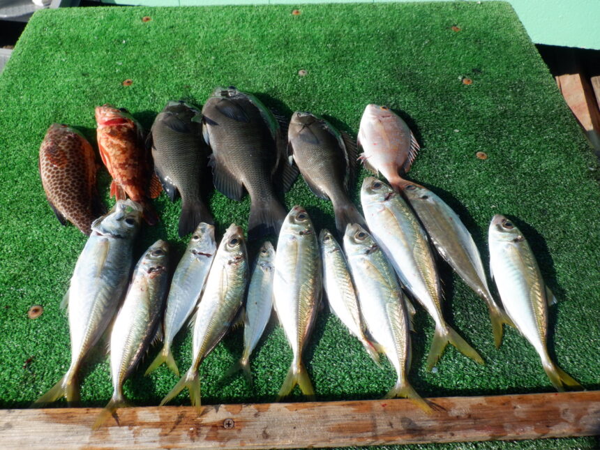 船外機ボートで別保さんがグレ、アジ、カサゴをゲット。