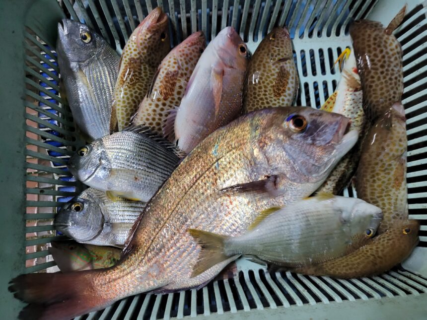 カセ釣りで石本さんがマダイ、ヘダイ、オオモンハタをゲット。