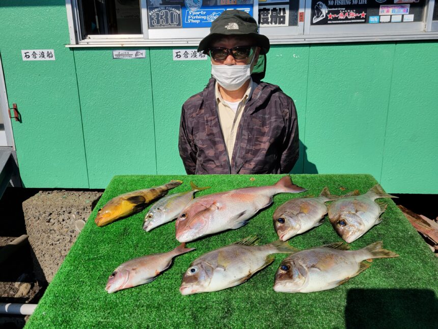 船外機ボートで尾垣さんがマダイ、メイチ、アオハタをゲット。