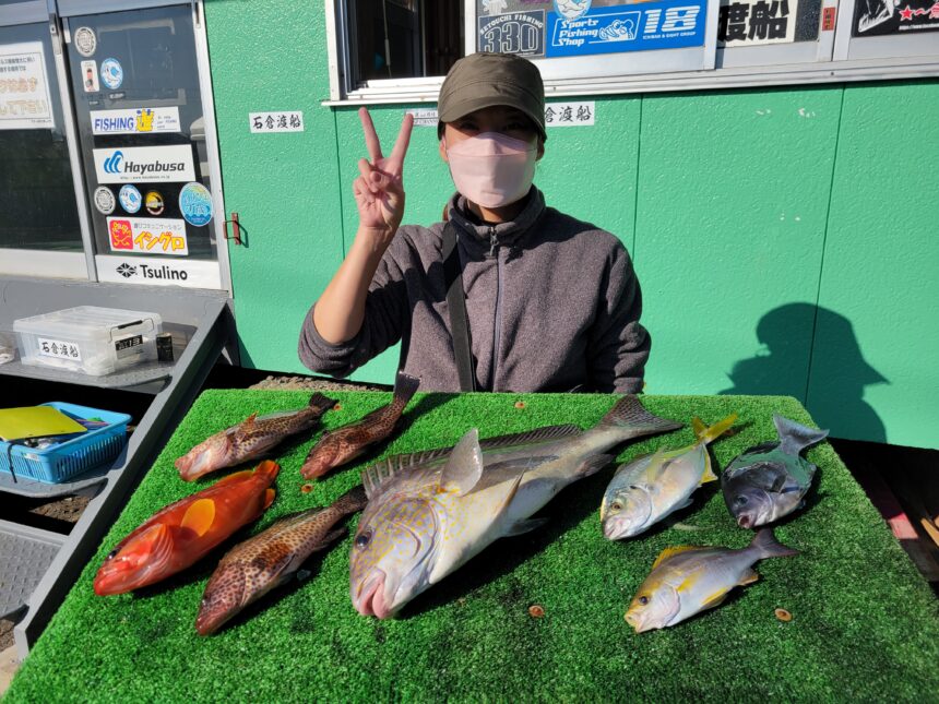 船外機ボートで笠子ちゃんがコロダイ、オオモンハタ、アカハタをゲット。