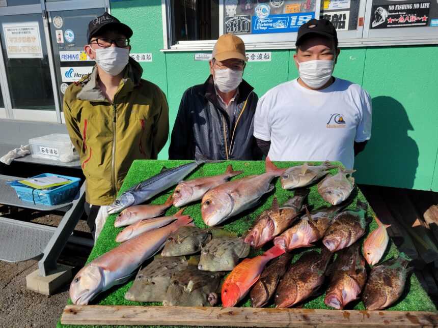船外機ボートで浅見さんがマダイ、シロアマダイ、オオモンハタ、サゴシ、メイチ、カワハギをゲット。
