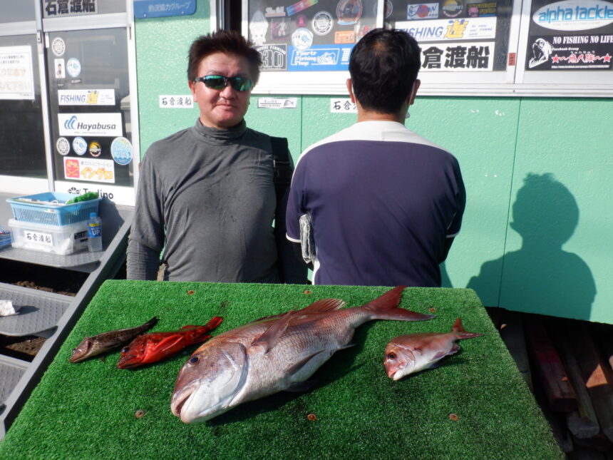 船外機ボートで鈴木さんがマダイ、カサゴ、オオモンハタをゲット。