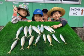 船外機ボートでかなと君、めいちゃん、そうた君、いぶき君がアジ、カタボシイワシをゲット。