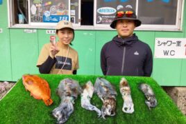 船外機ボートで鈴木さんがアオリイカ、アカハタをゲット。