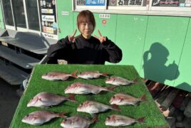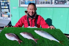 船外機ボートで稲森さんがマダイ、ツバス、メイチをゲット。