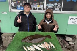 船外機ボートで池口さんがヒラメ63㎝、アジをゲット。