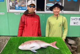 船外機ボートで川野さんがマダイ60㎝をゲット。
