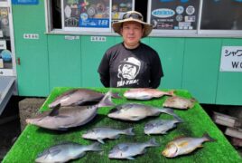 船外機ボートで水野さんがオオモンハタ、ツバスをゲット。